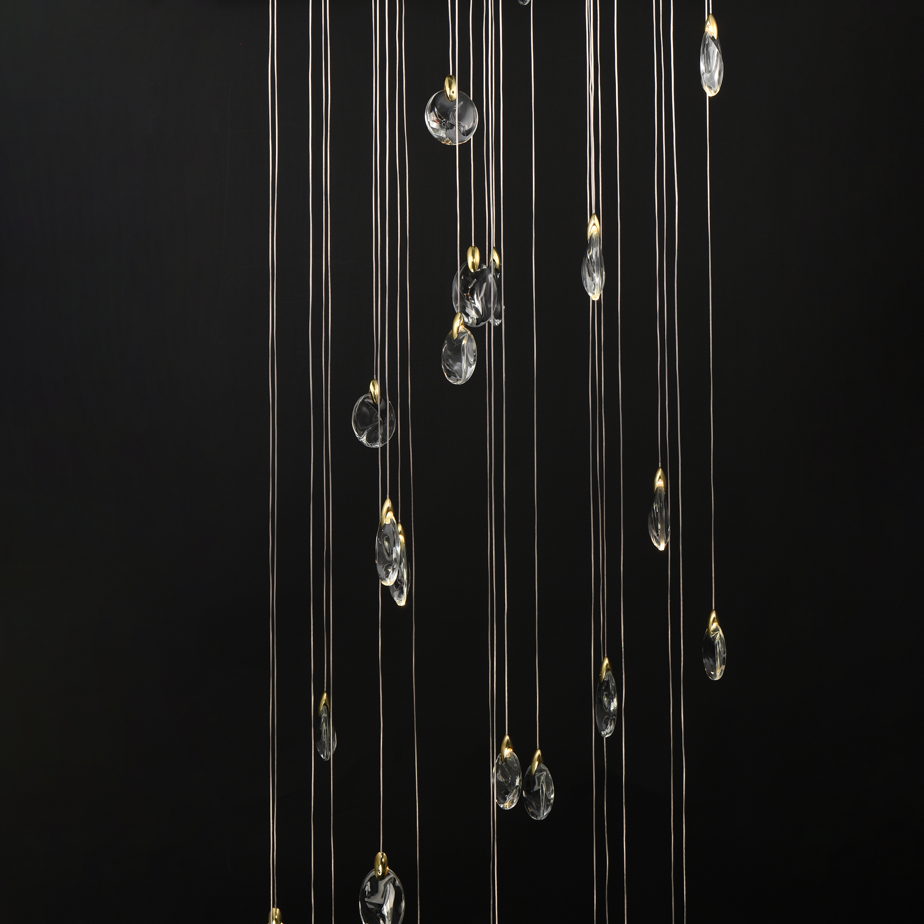 As if naturally formed from the ebbing shores of a riverbed, smooth and irregularly shaped crystal pebbles are suspended by cast metal clasps in a Polished Gold finish. Discreetly illuminated by concealed LED light sources within the clasps, additional downlight originates from LED GU10 lamps housed in a Matte Black canopy adding to the refracting iridescent shimmer on the crystal surface below. Available in multiple configurations of pendants as well as sconce options.