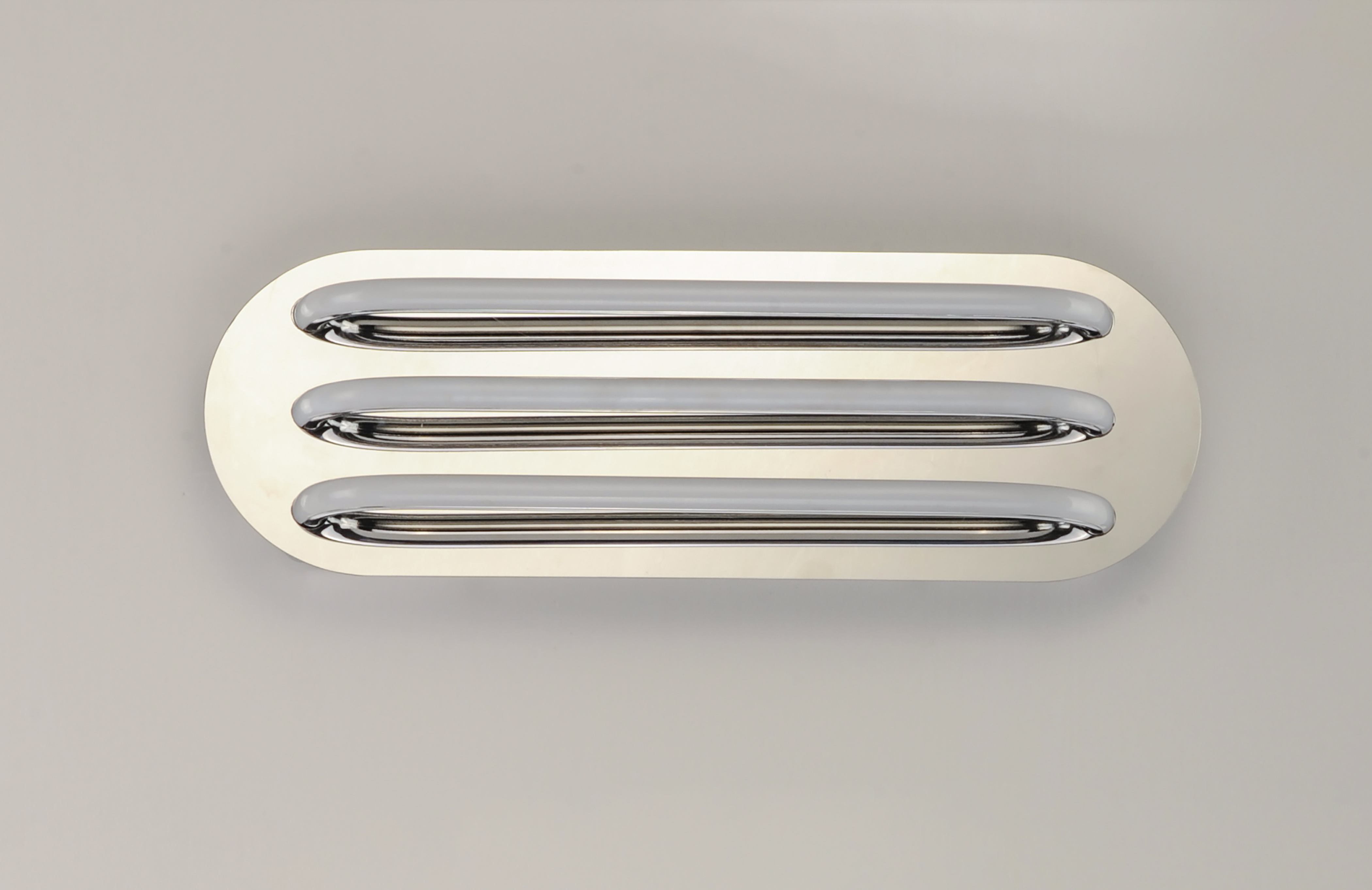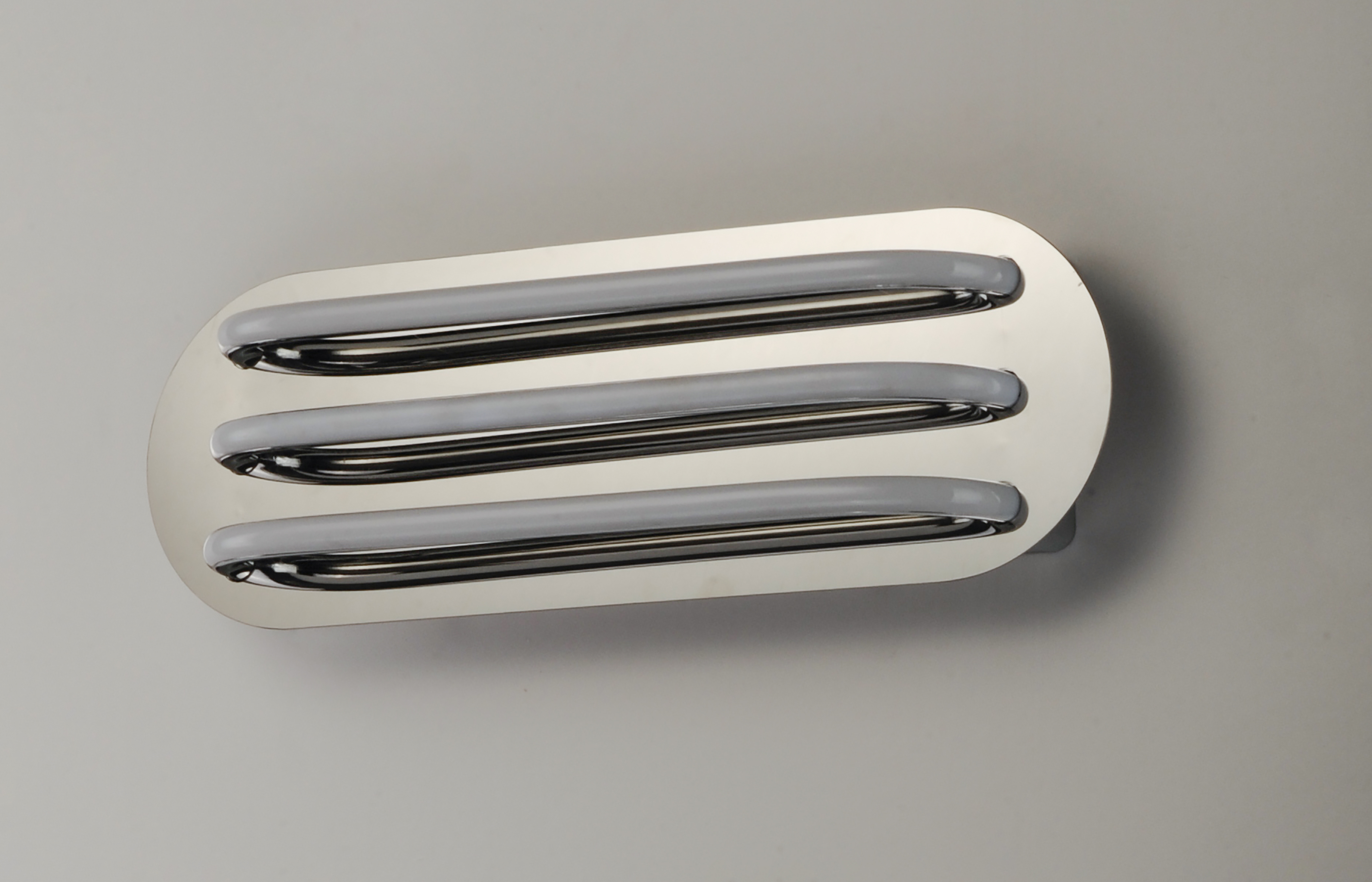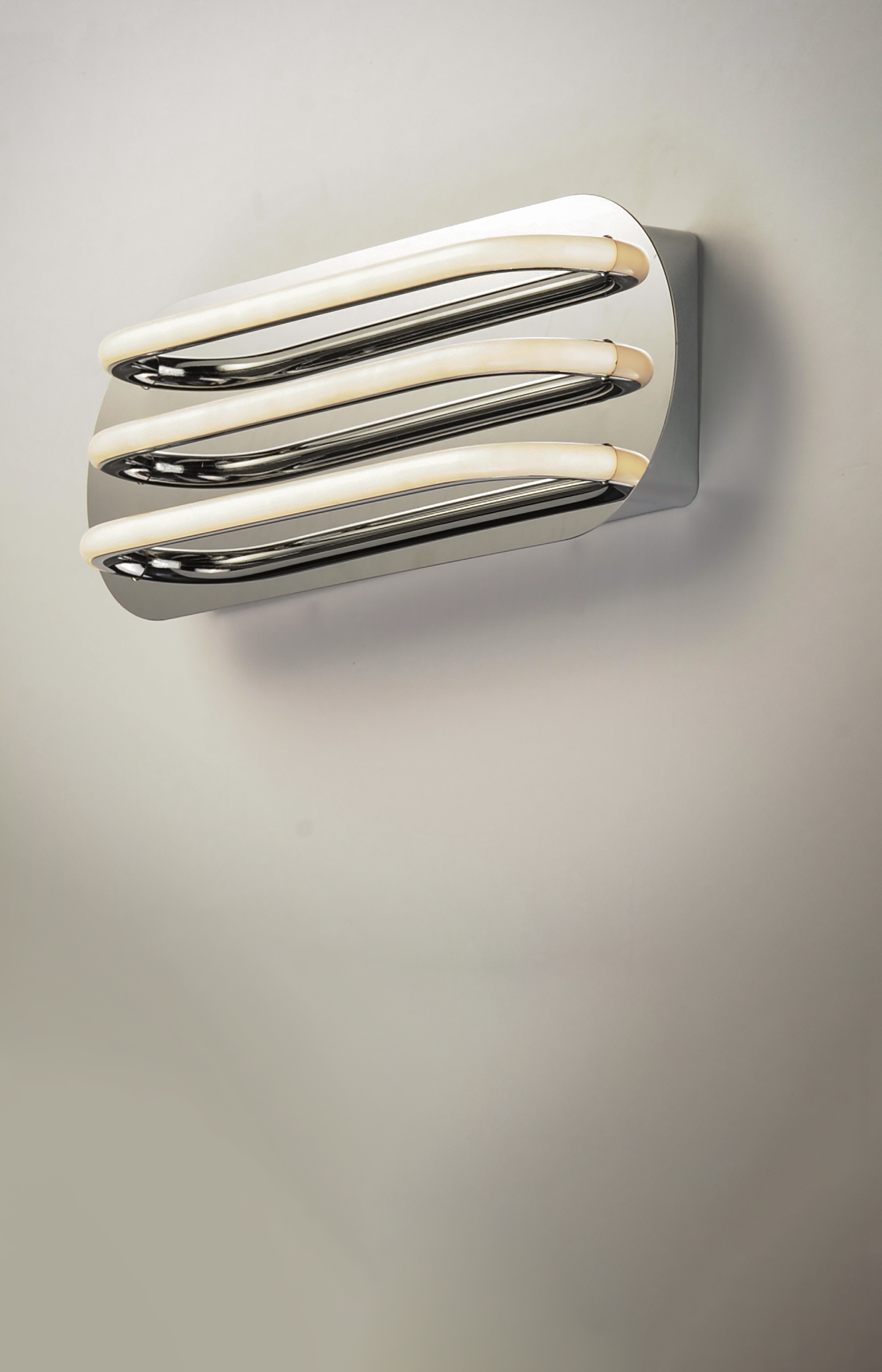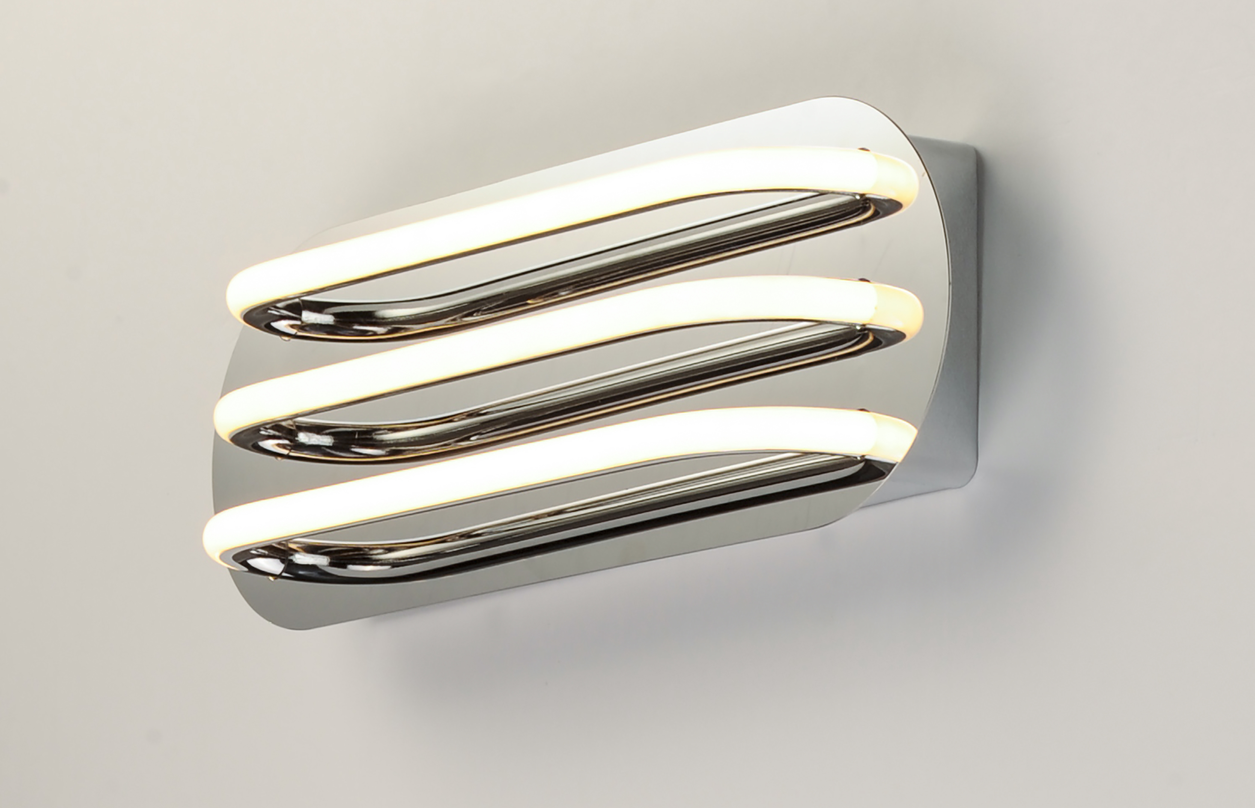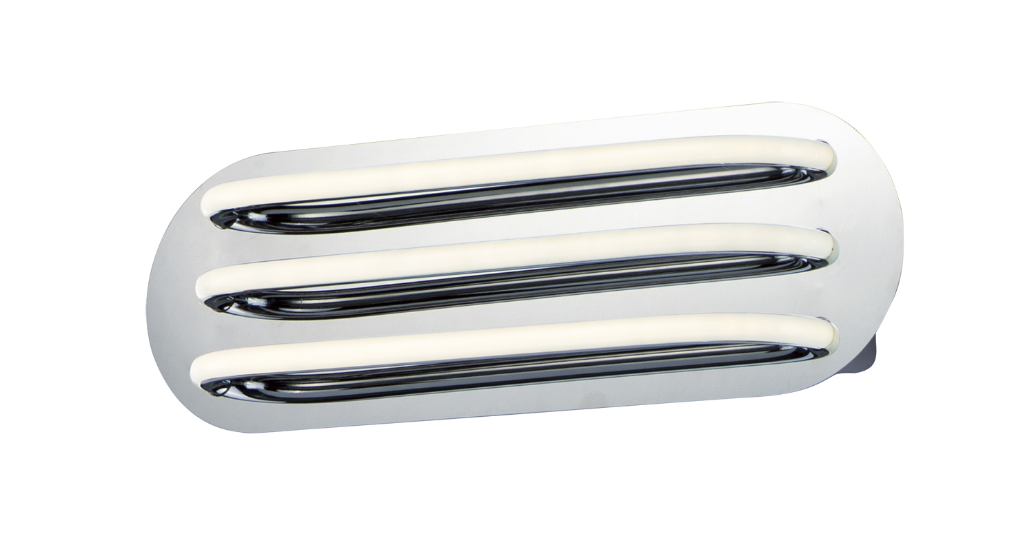 Three bands horizontally span plates of Polished Chrome then disappear as they return to the backplate. Ample light is given by means of the 3000K LED which is fully dimmable for the ultimate in bath vanity illumination.