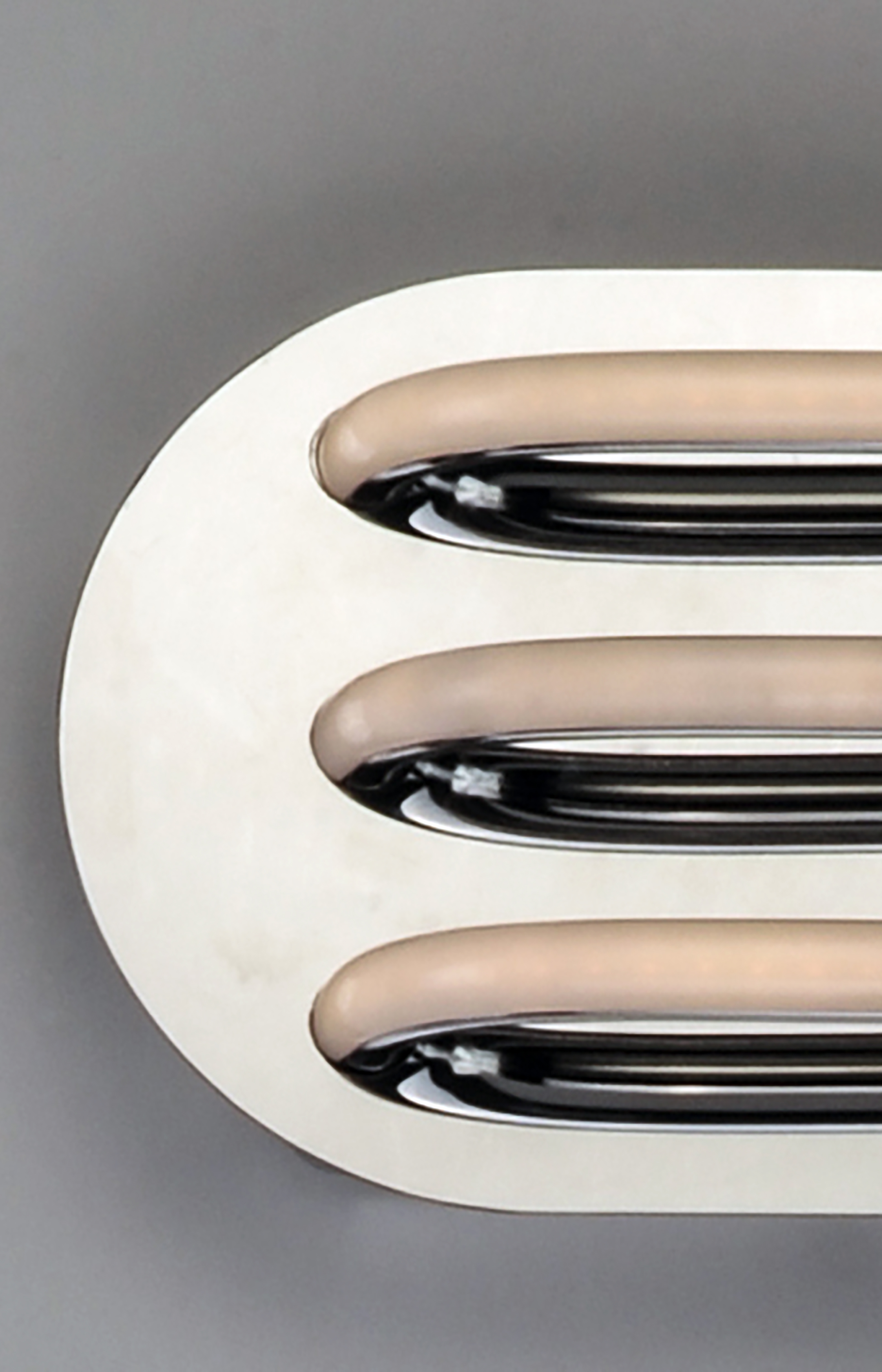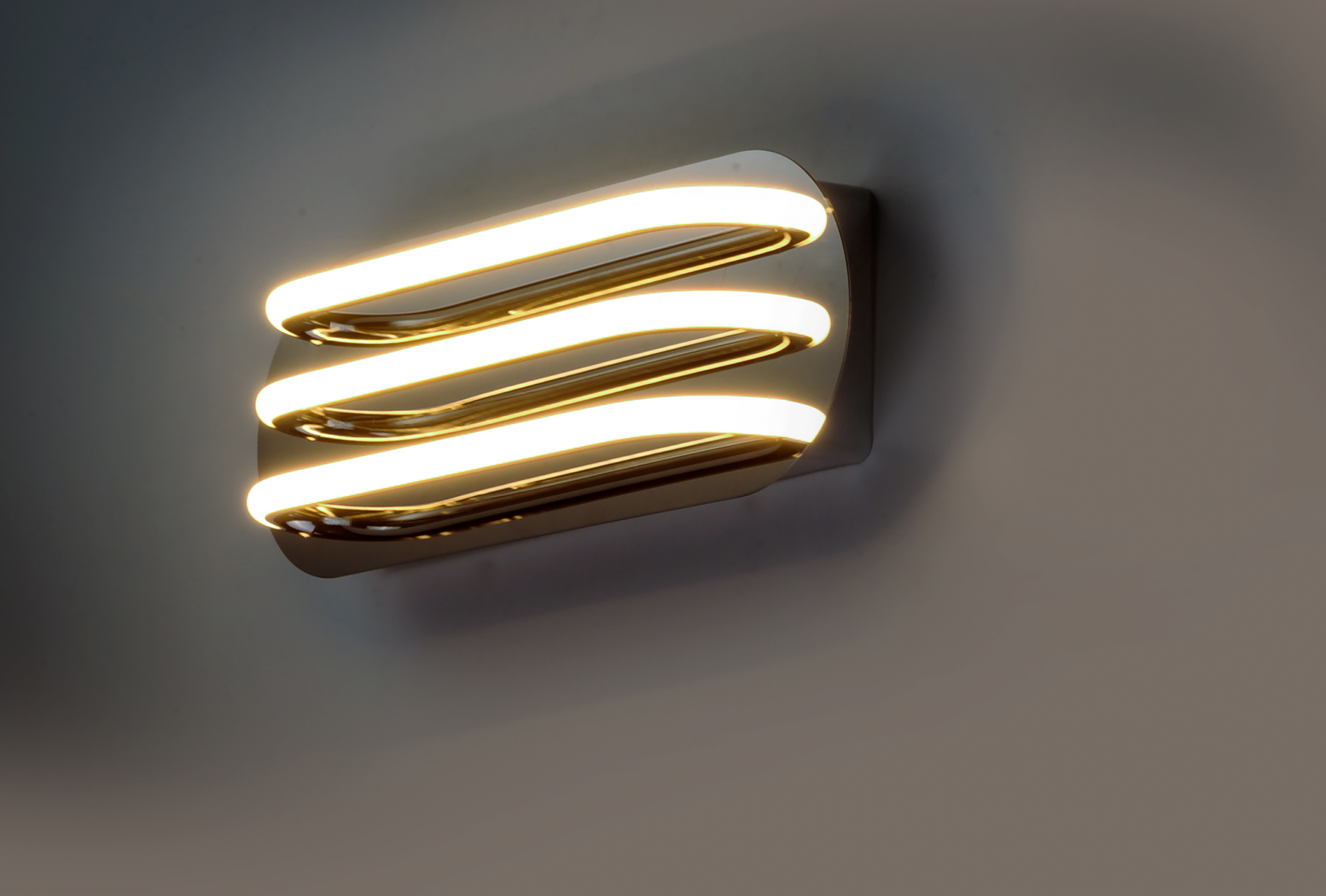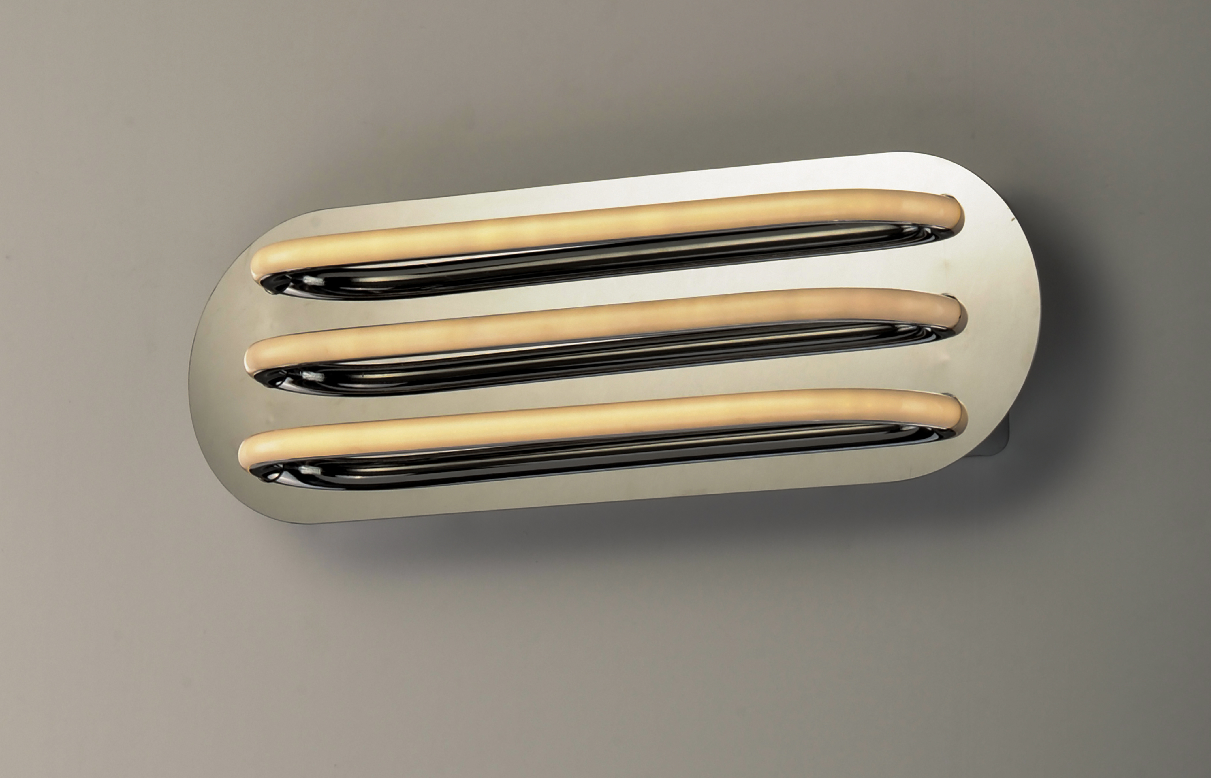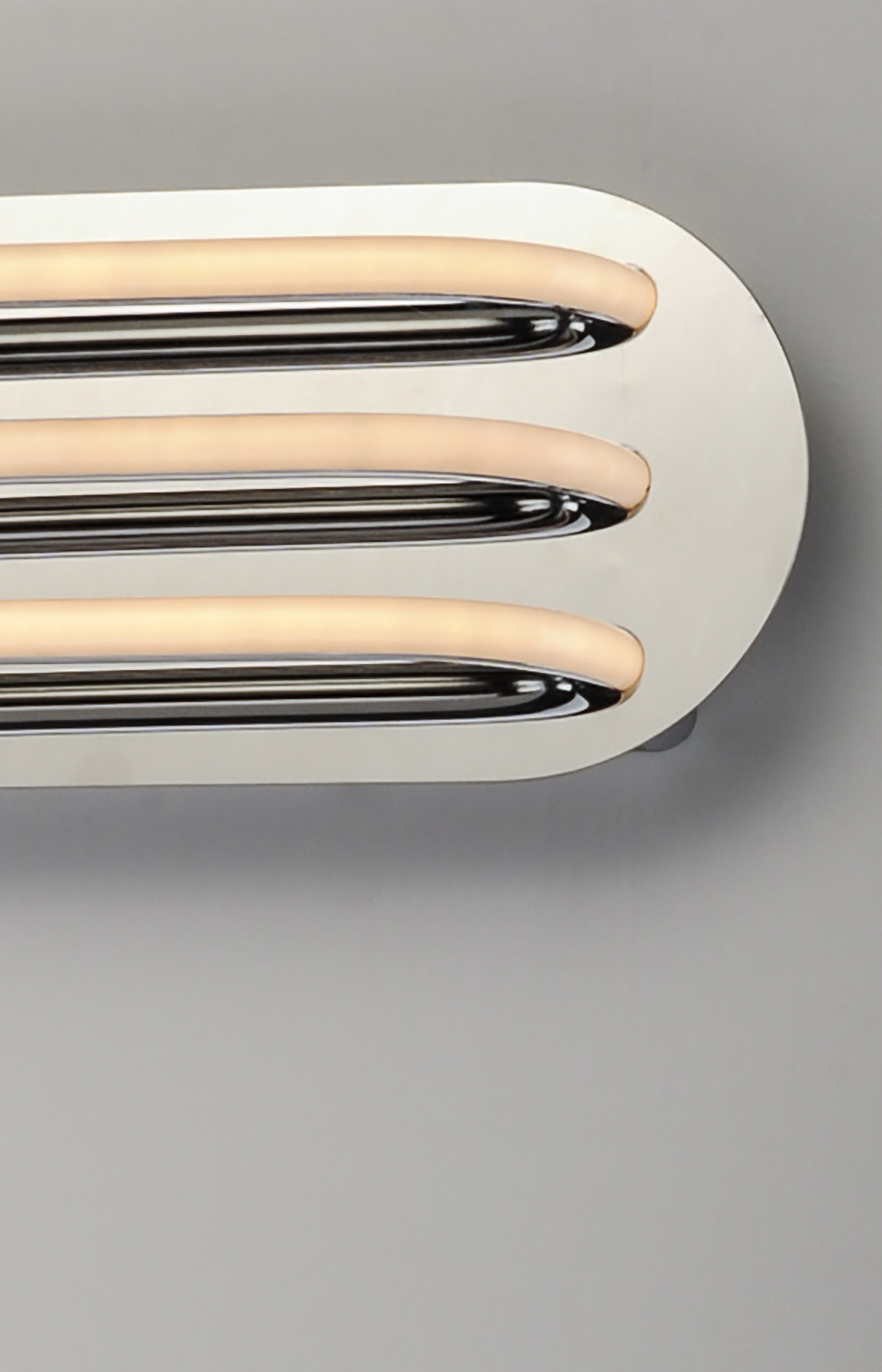 Three bands horizontally span plates of Polished Chrome then disappear as they return to the backplate. Ample light is given by means of the 3000K LED which is fully dimmable for the ultimate in bath vanity illumination.