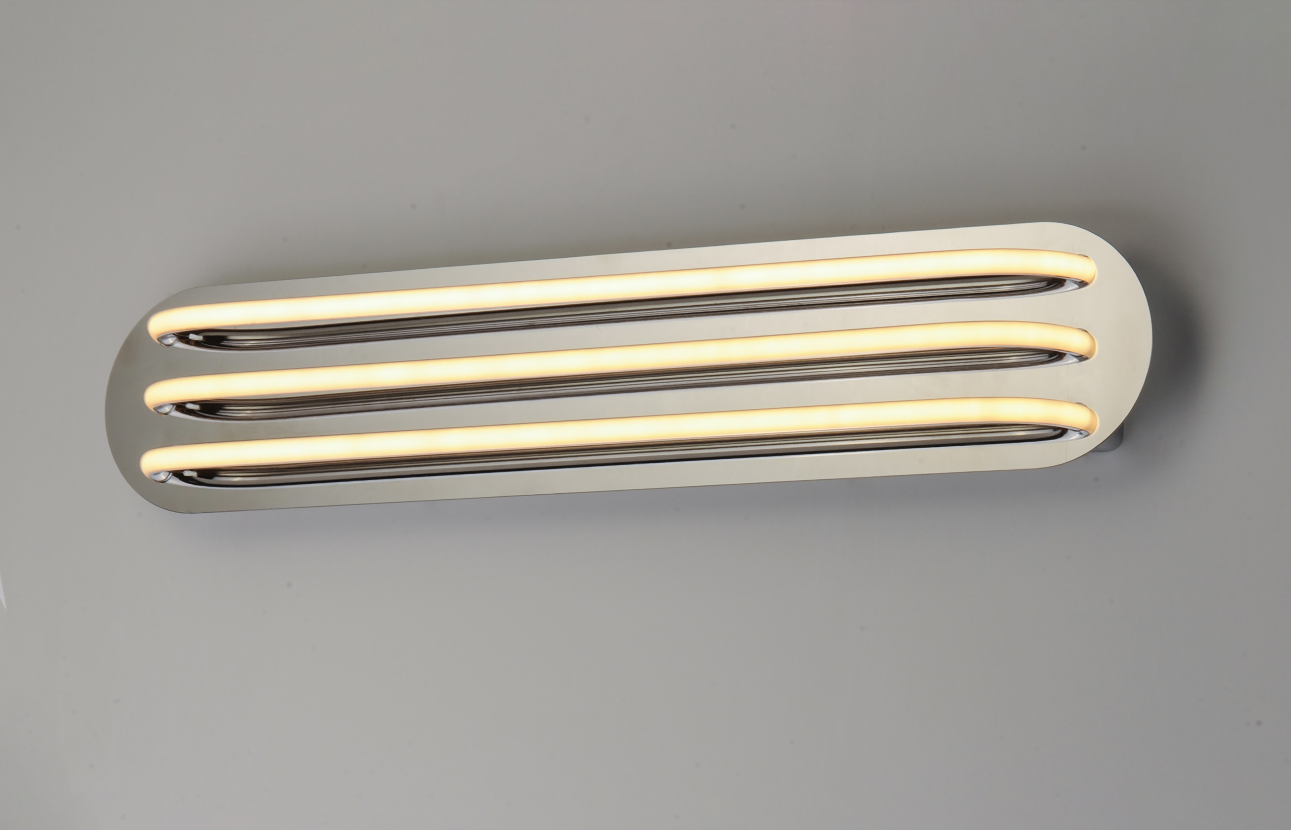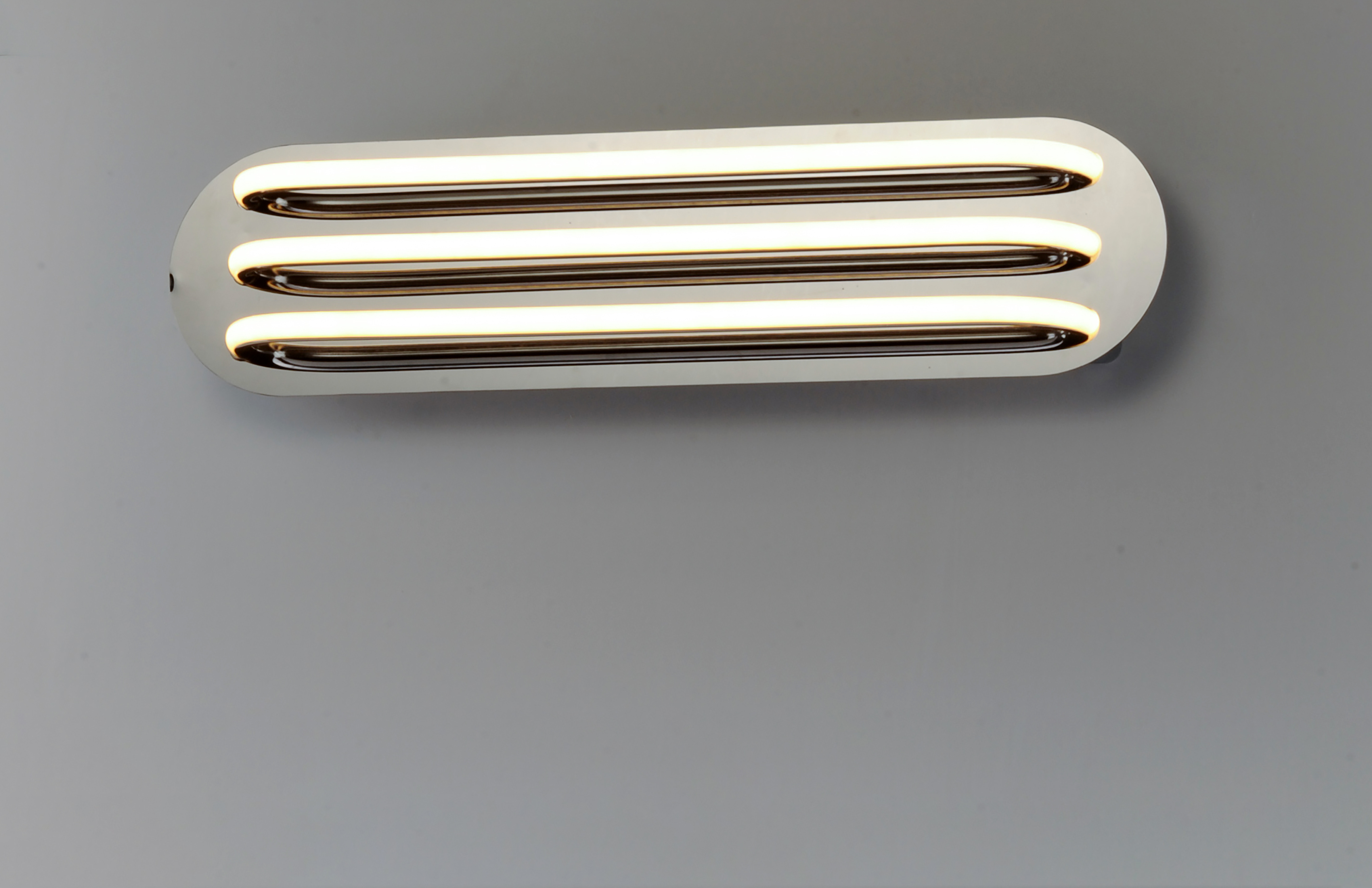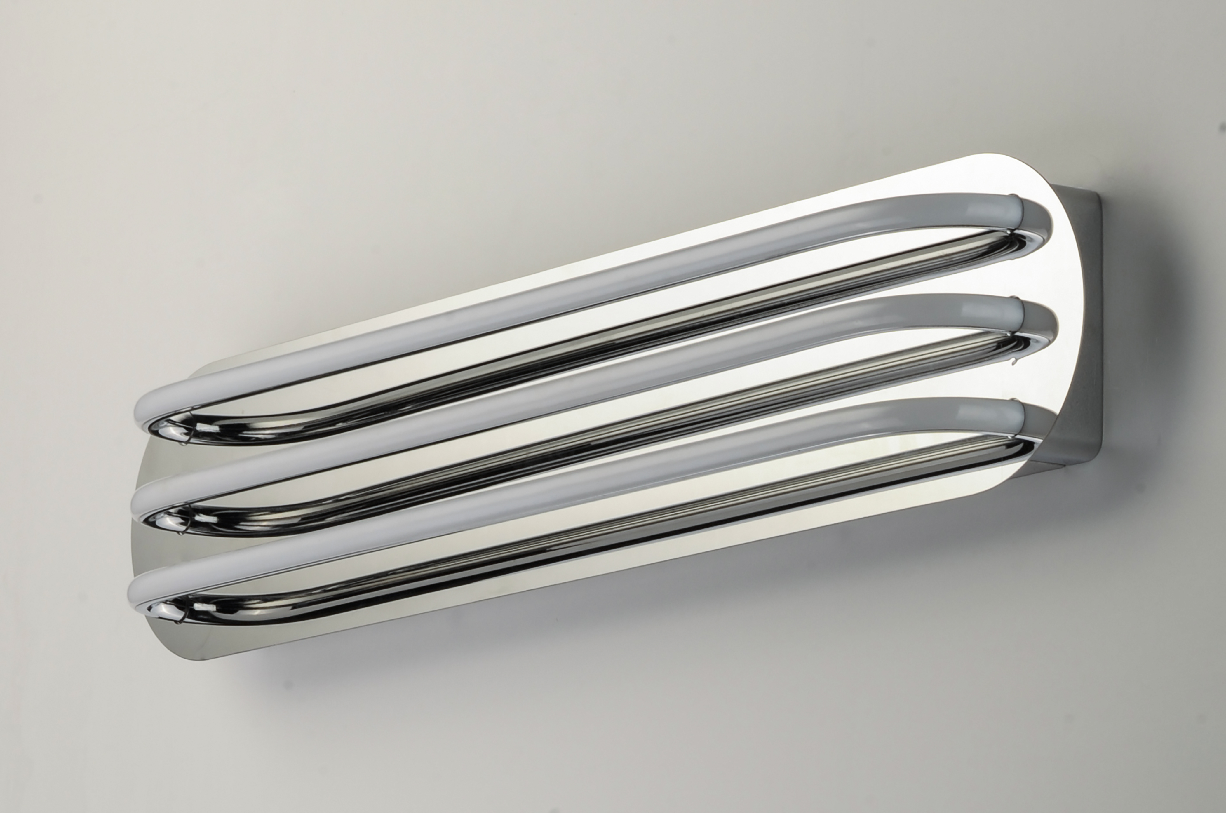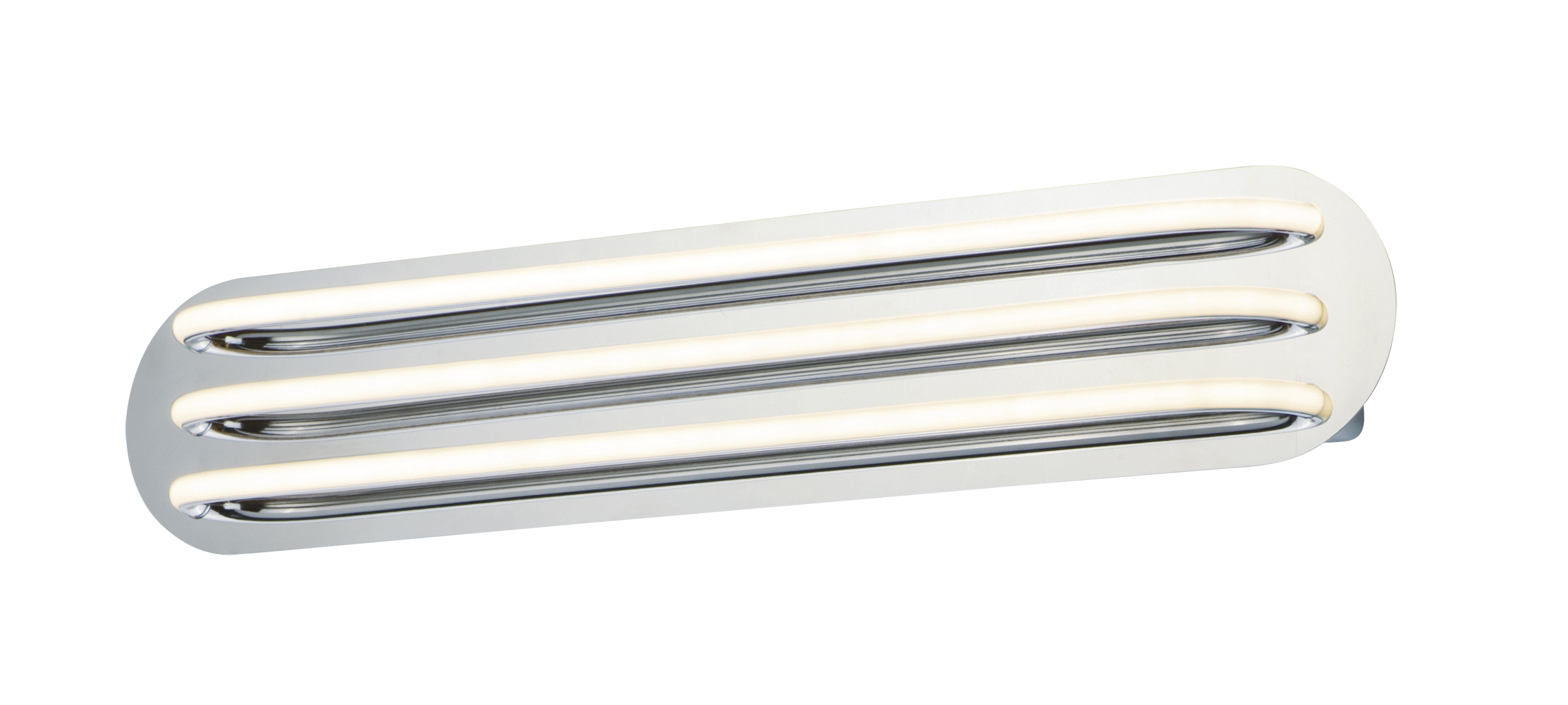 Three bands horizontally span plates of Polished Chrome then disappear as they return to the backplate. Ample light is given by means of the 3000K LED which is fully dimmable for the ultimate in bath vanity illumination.