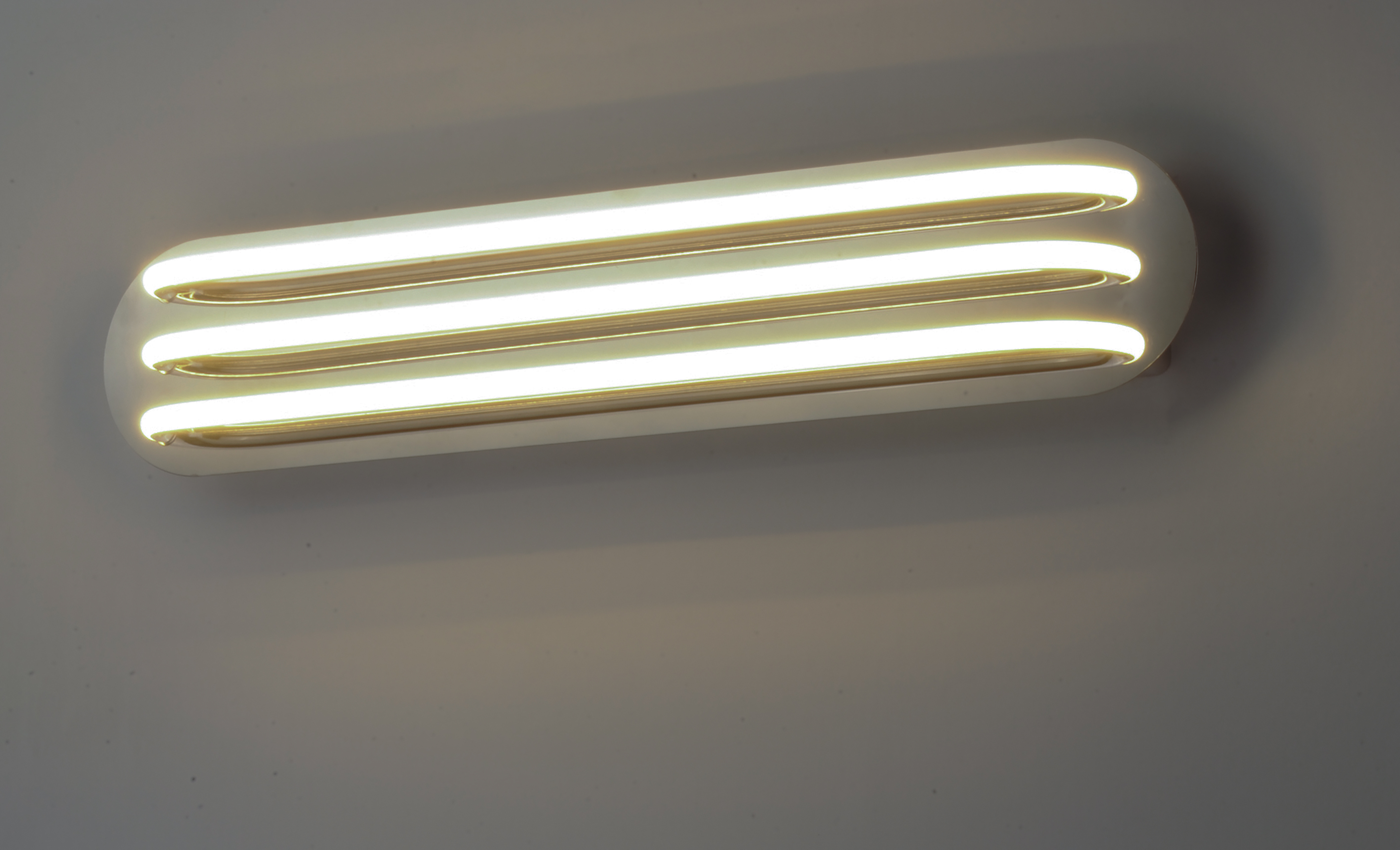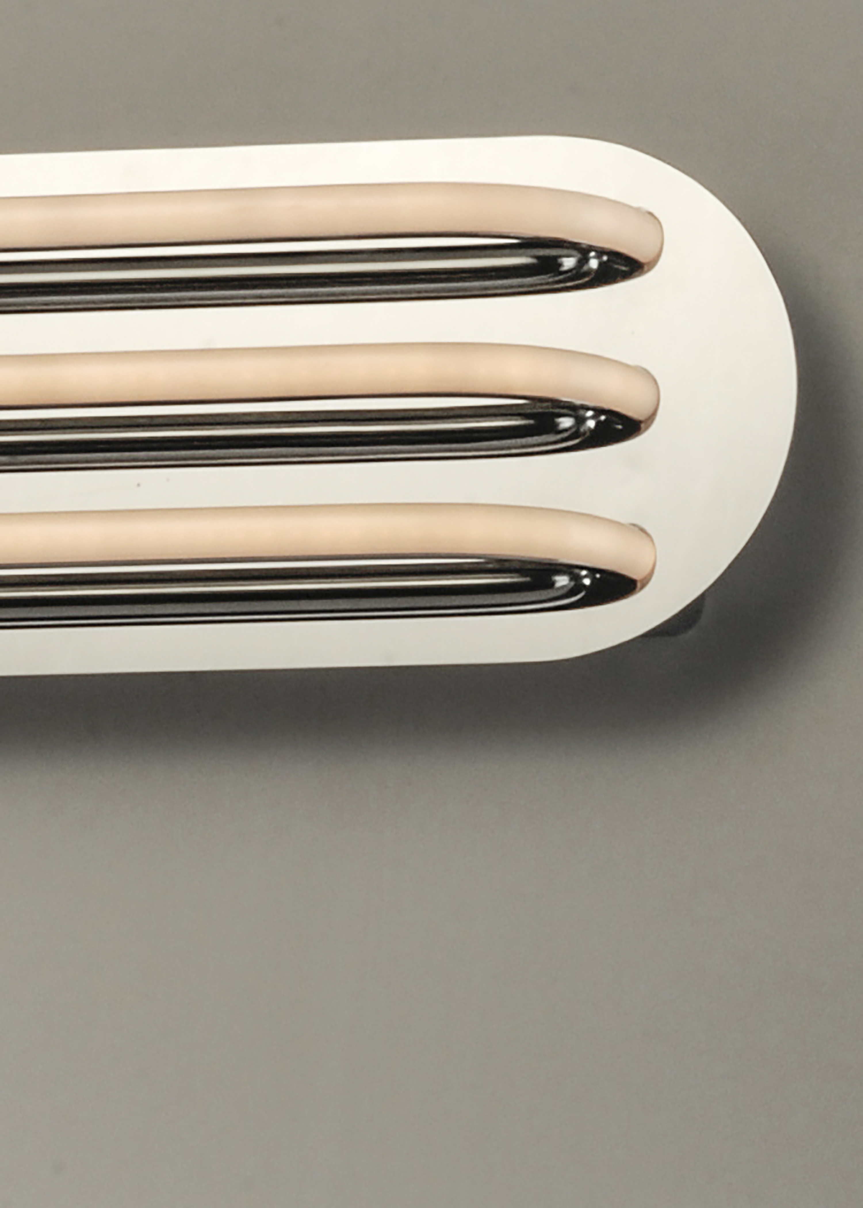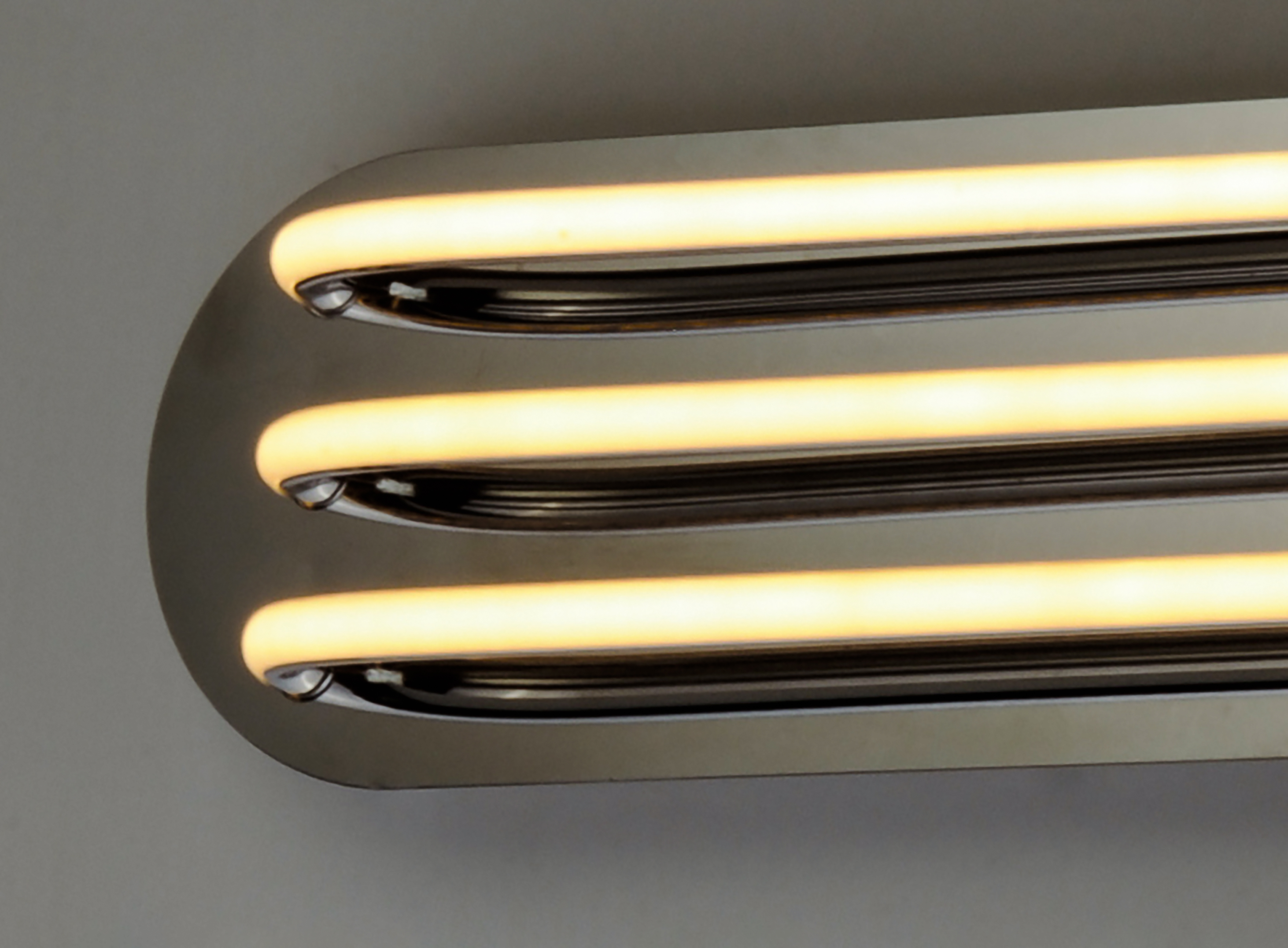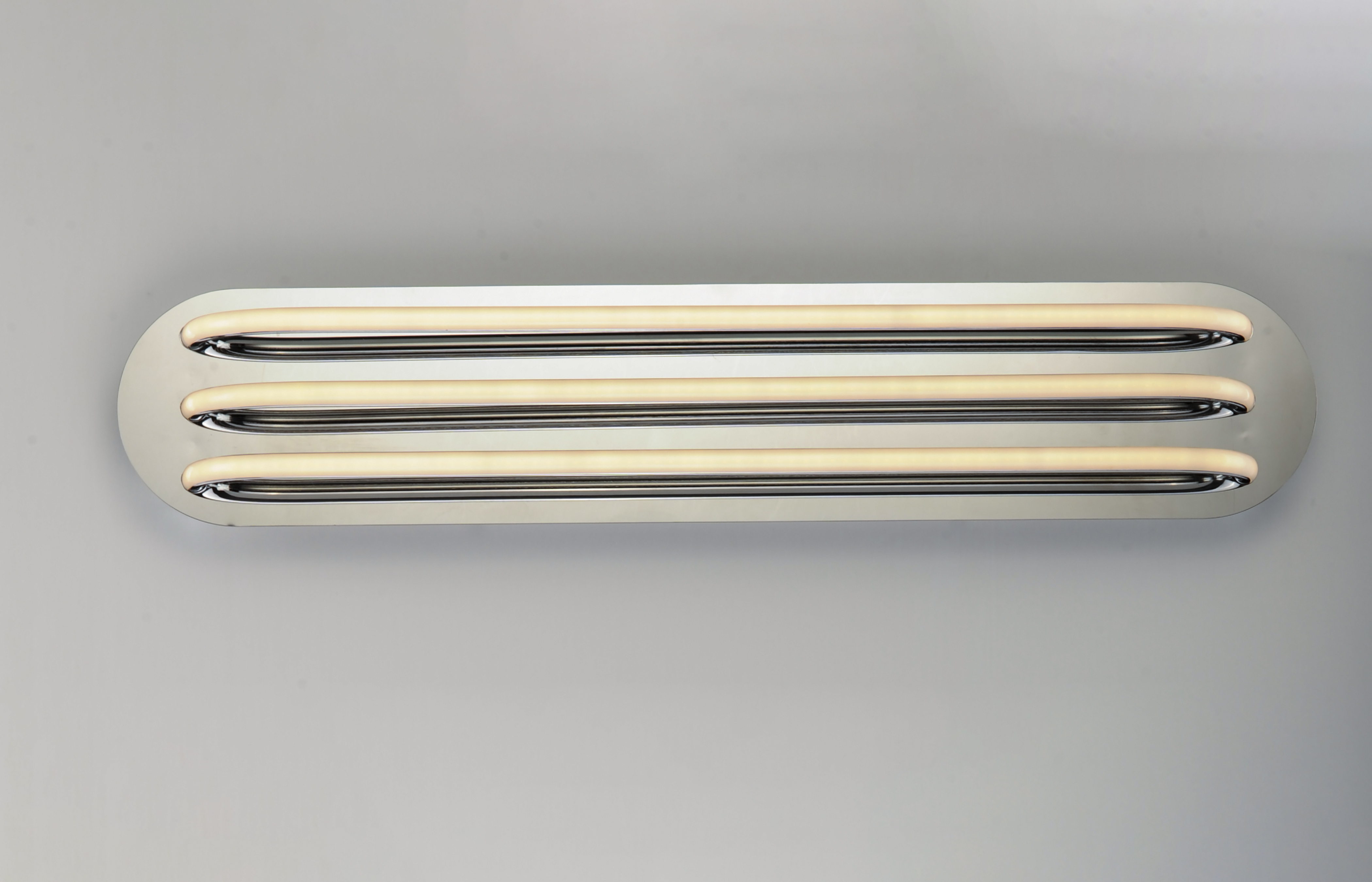 Three bands horizontally span plates of Polished Chrome then disappear as they return to the backplate. Ample light is given by means of the 3000K LED which is fully dimmable for the ultimate in bath vanity illumination.
