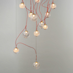 Numerous spheres of heavy Bubble Glass are suspended in an avant-garde fashion connected at various points with a contrasting red cord that creates an artistic impression of light. The Polished Chrome canopy reflects light from the integrated LED in a galaxy-like fashion.