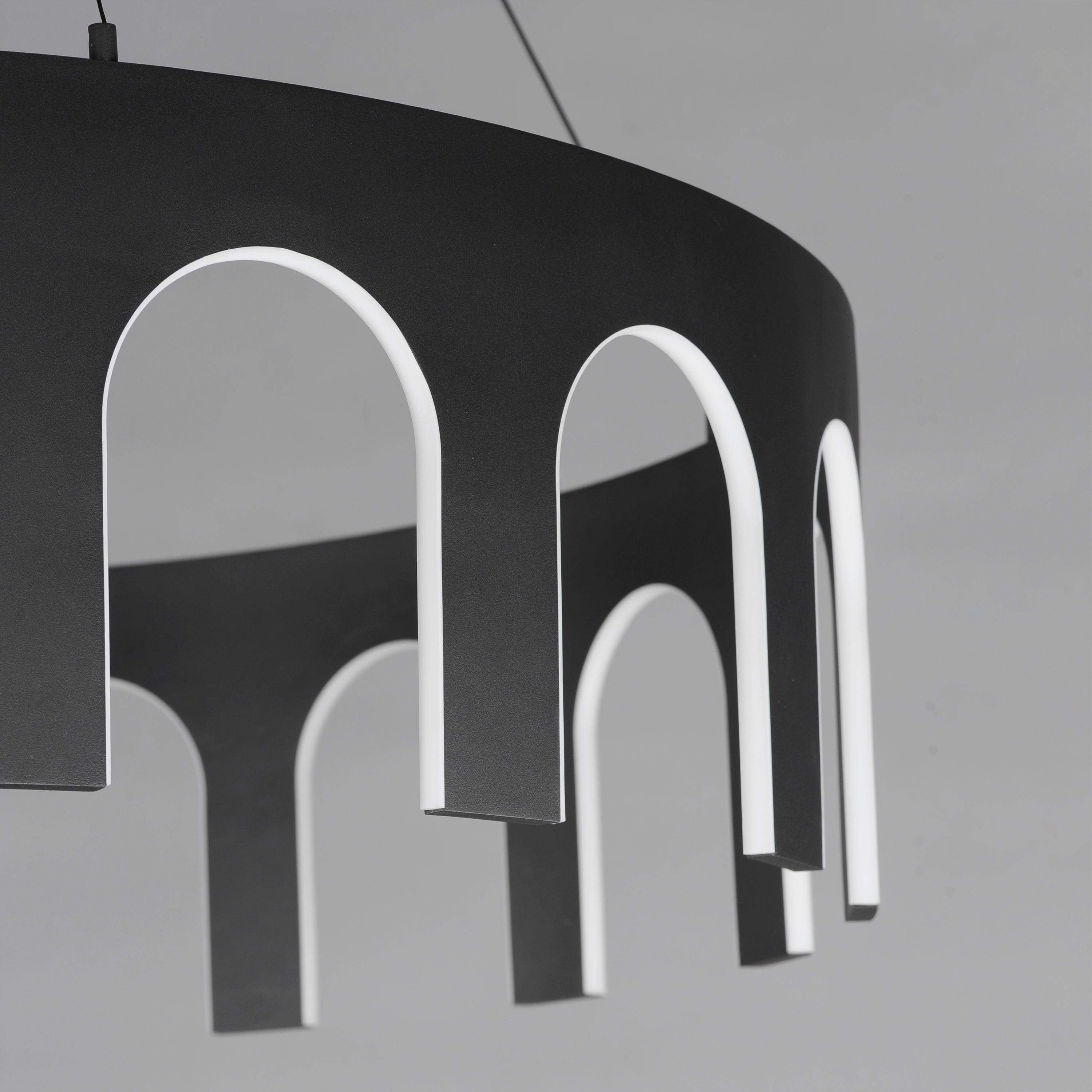 A robust black metal frame is connected by a series of arches that are individually illuminated with LED technology. The form creates the vision of a crown and constructed in a similar fashion that emulates the Roman aqueducts.