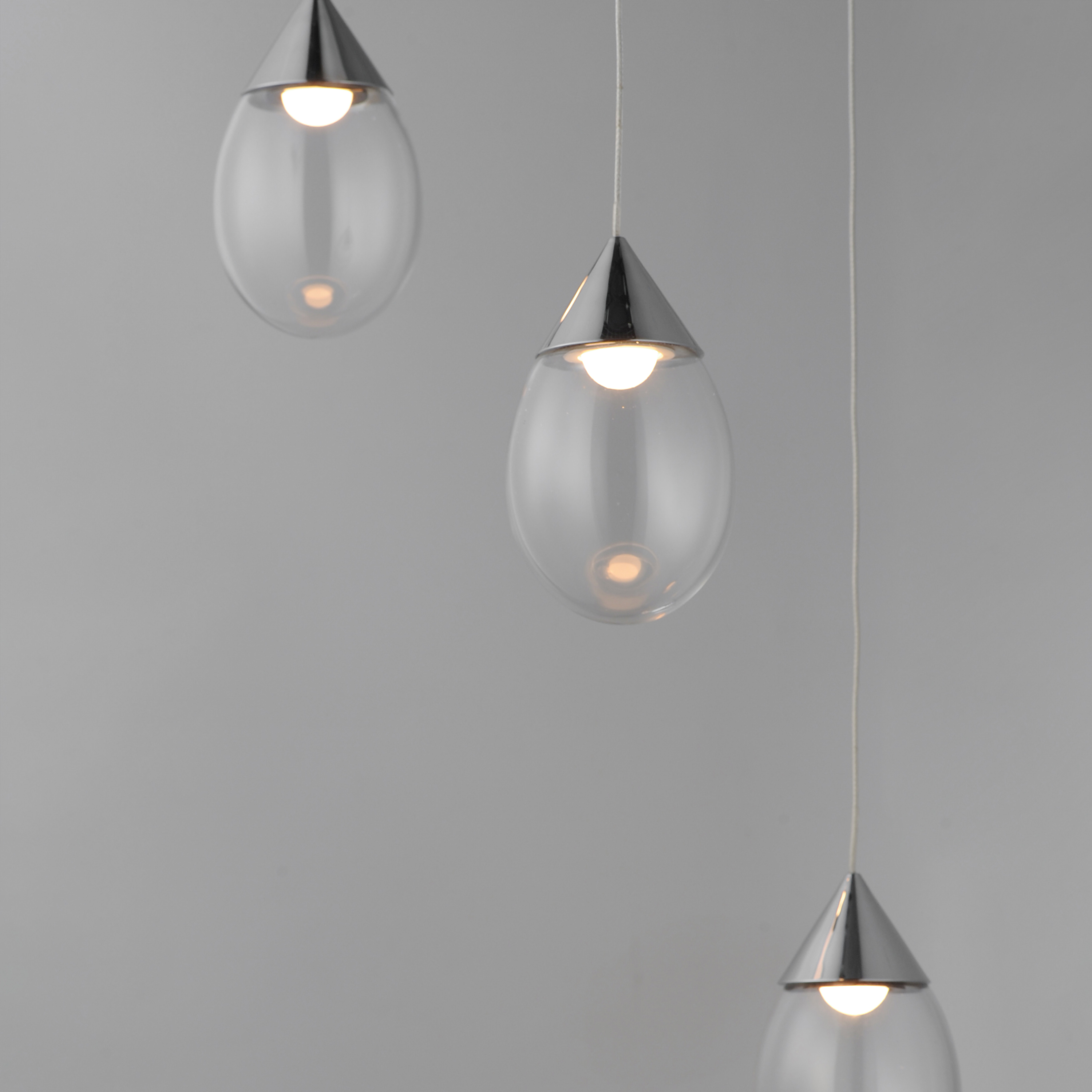 Suspended from slim cords, drops of blown glass encase a recessed LED light source casting light along the thick bottomed glass. Available in Polished Chrome with clear glass or Matte Black with Mirror Smoked Glass, this simple design adds a statement to light.