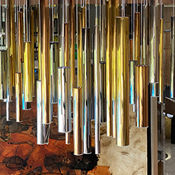 Elongated metal tubes in a variety of finishes from Rose Gold to Polished Chrome suspend from pans to create impressive sculptural statements. Each tube encase a replaceable integrated LED module while many of the ceiling pans house additional LED spots to highlight the beautiful high gloss finishes as well as additional down light.