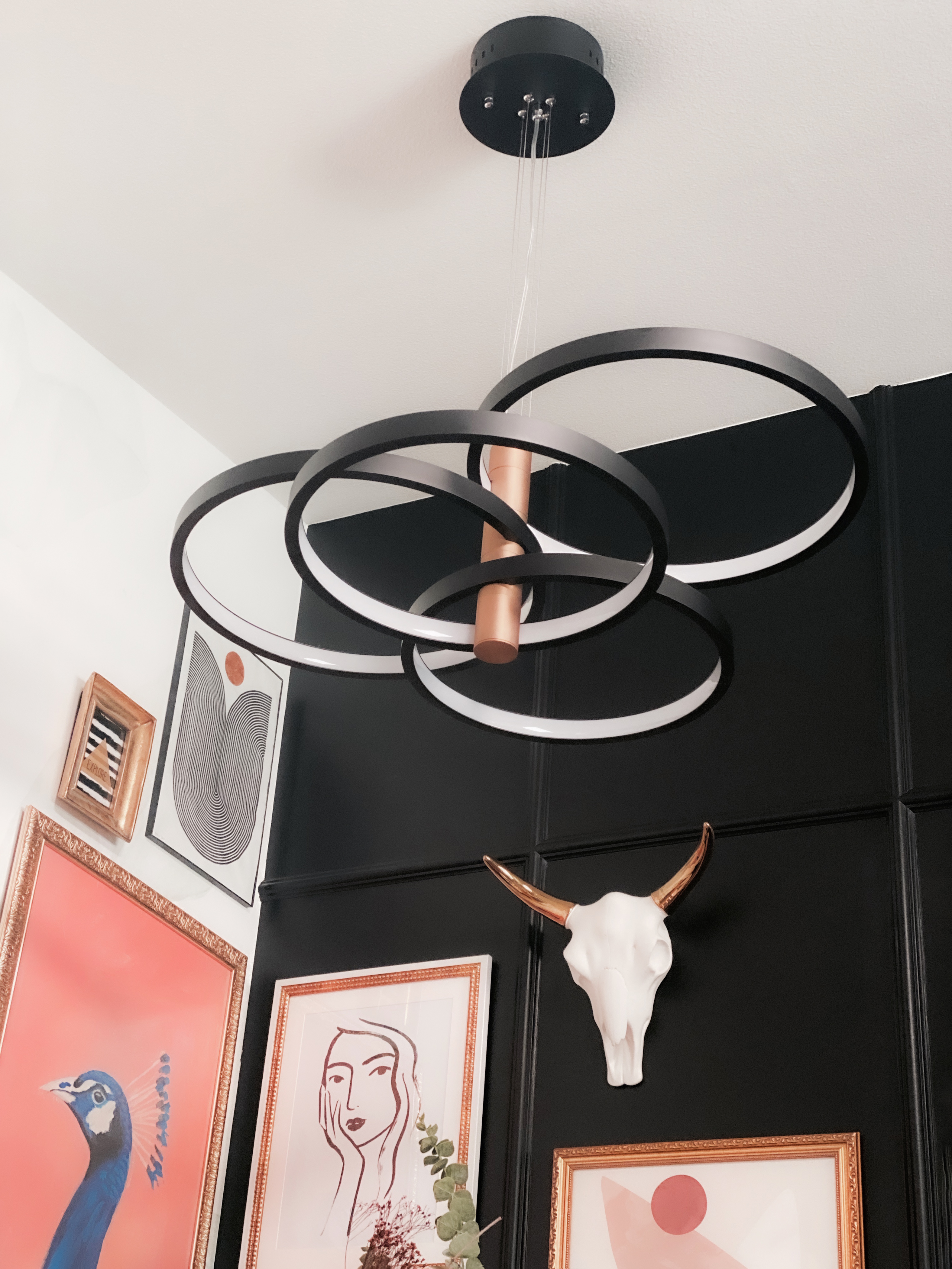 Rings of various sizes finished in Black are supported from a column of soft Gold. This European classic is a soft contemporary design which works in today's home decor.
