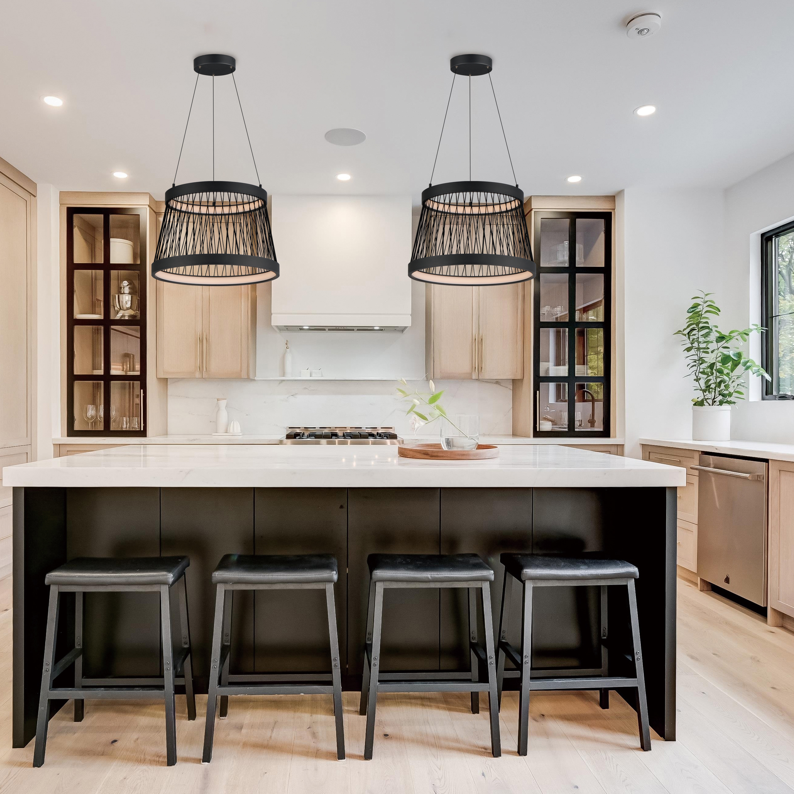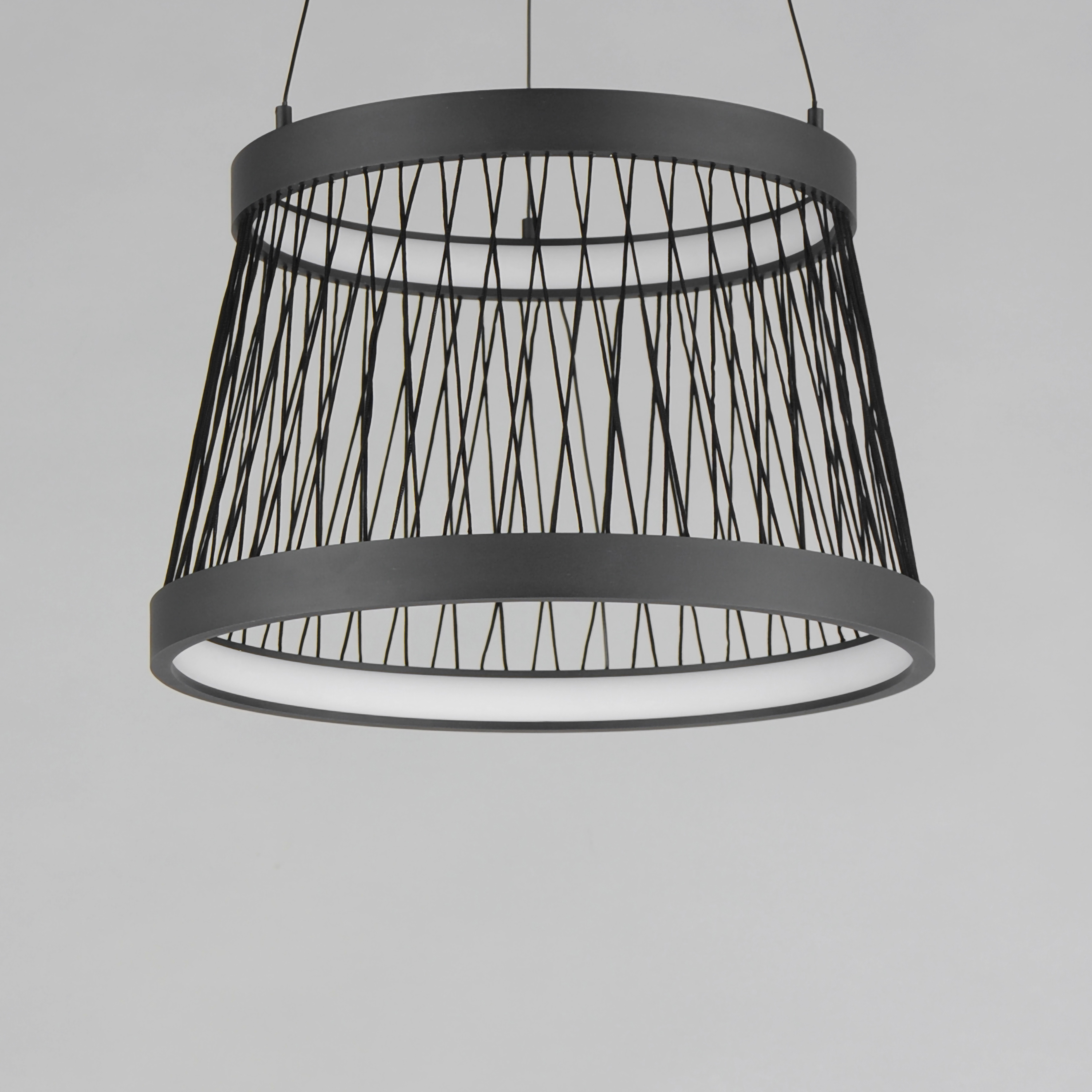 Cross-threaded strands of cotton are strung through two Matte Black illuminated rings of LED. The black cotton thread creates a form both structural and airy in composition. These pendants perfectly capture the art of weaving techniques by producing a large truncated cone of with the use of minimal material.