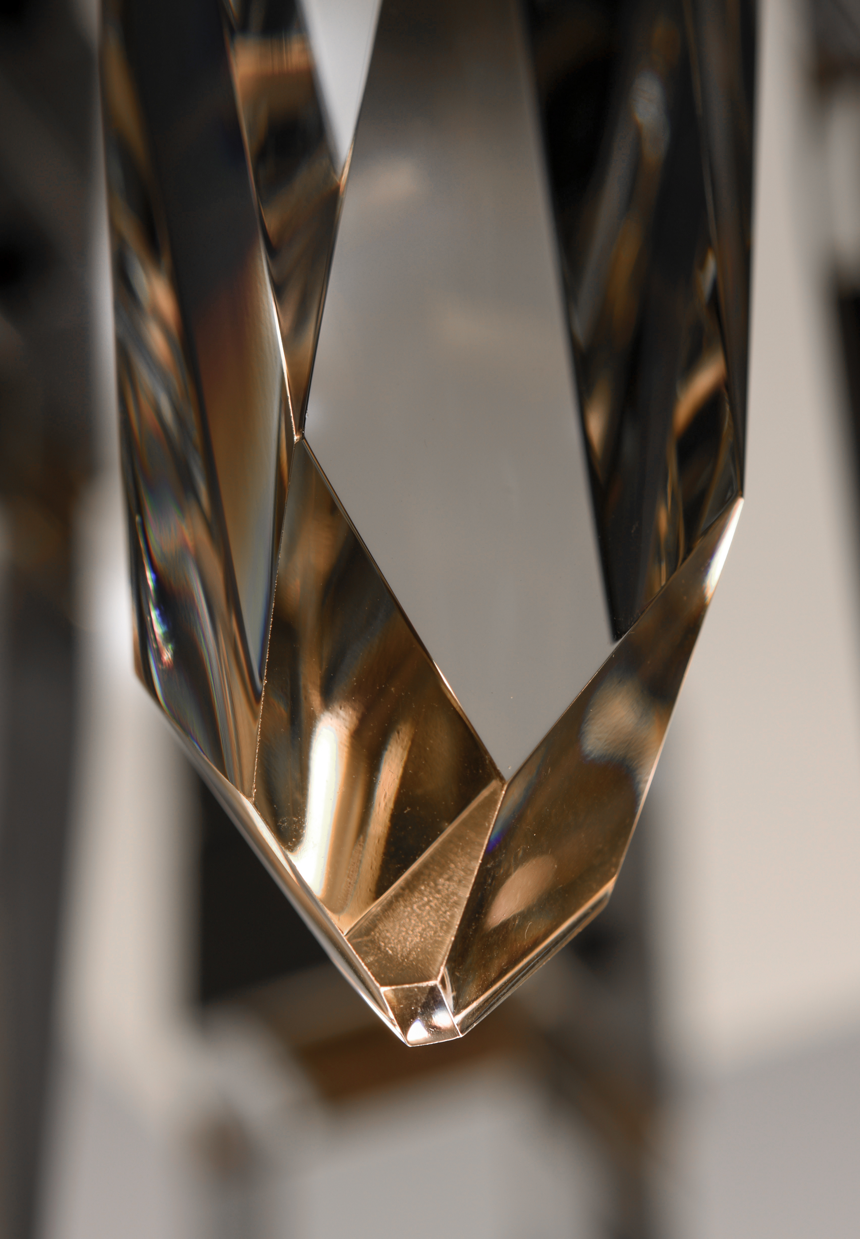 Stalactites of Clear Beveled crystal suspend from your choice of Polished Chrome or Black supports, can be hung at various heights to create a spectacular array. The crystal shimmers as light diffuses through the facets powered by 90 CRI LED dimmable modules.