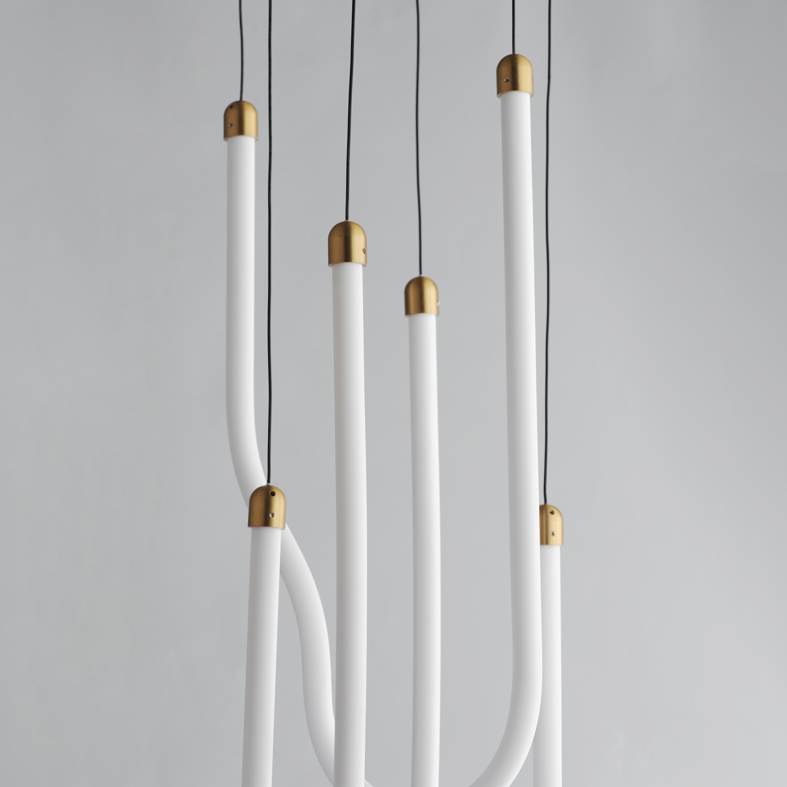 Sweeping matte white acrylic tubes encase an omnidirectional LED light source, arranged in abstract configurations inspired by solar flares. Minimal in composition yet dramatic in form, the Soleil collection offers a striking lighting solution. Available in a range of sizes, including fixed flush mount and field-adjustable pendant configurations, Soleil is offered in Polished Chrome, Matte Black, and Natural Aged Brass, making it a perfect complement to a variety of interior color schemes.