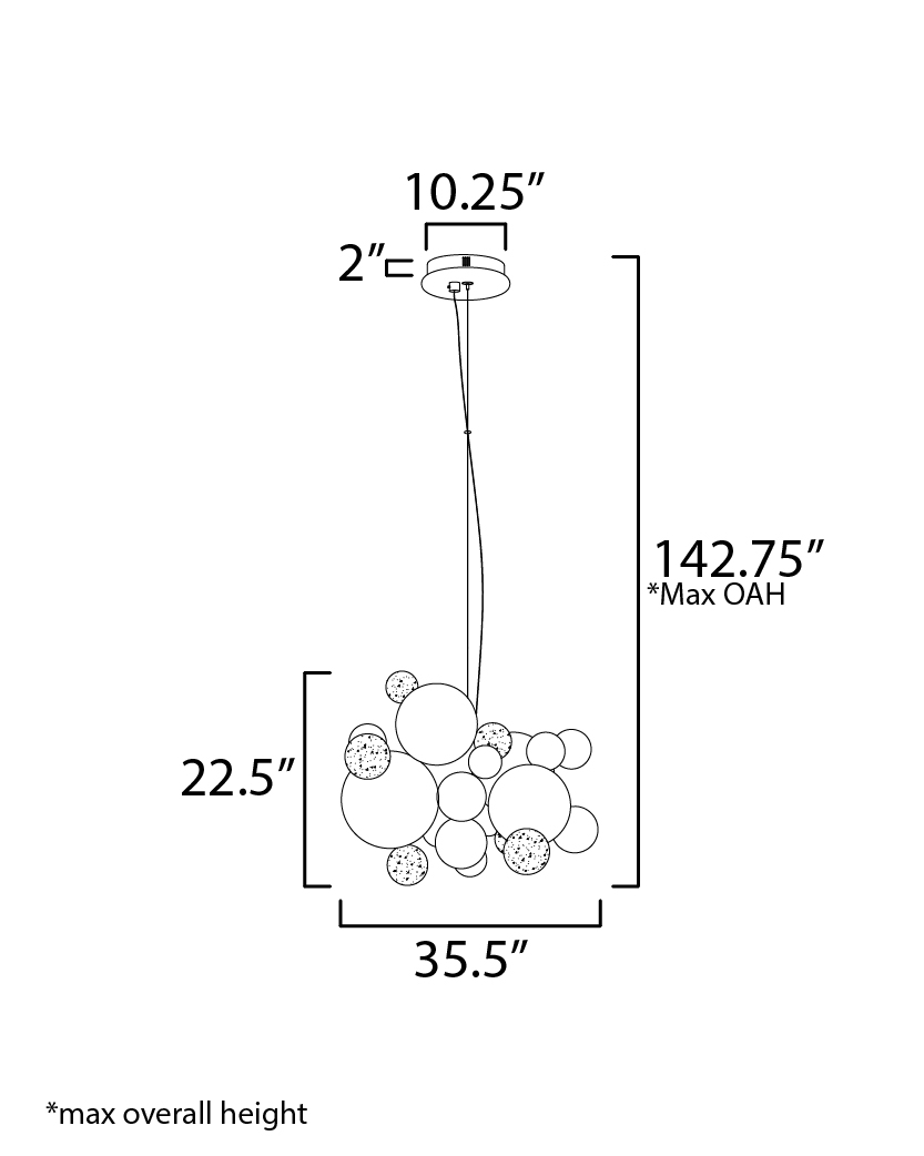 Evocative of turbulent skies, Stormy is a sculptural masterwork that transforms negative space into visual drama. A billowing cluster of stainless-steel spheres, finished in a moody interplay of Black Nickel, French Gold, and Polished Chrome, creates an abstract cloudscape of extraordinary depth. Floating among the forms, matte white glass globes in varying sizes emit a layered, ambient glow, while discreet canopy-mounted downlights provide refined functionality. Offered in two commanding sizes, Stormy is both art and atmosphere--an expression of elemental motion rendered with impeccable precision.