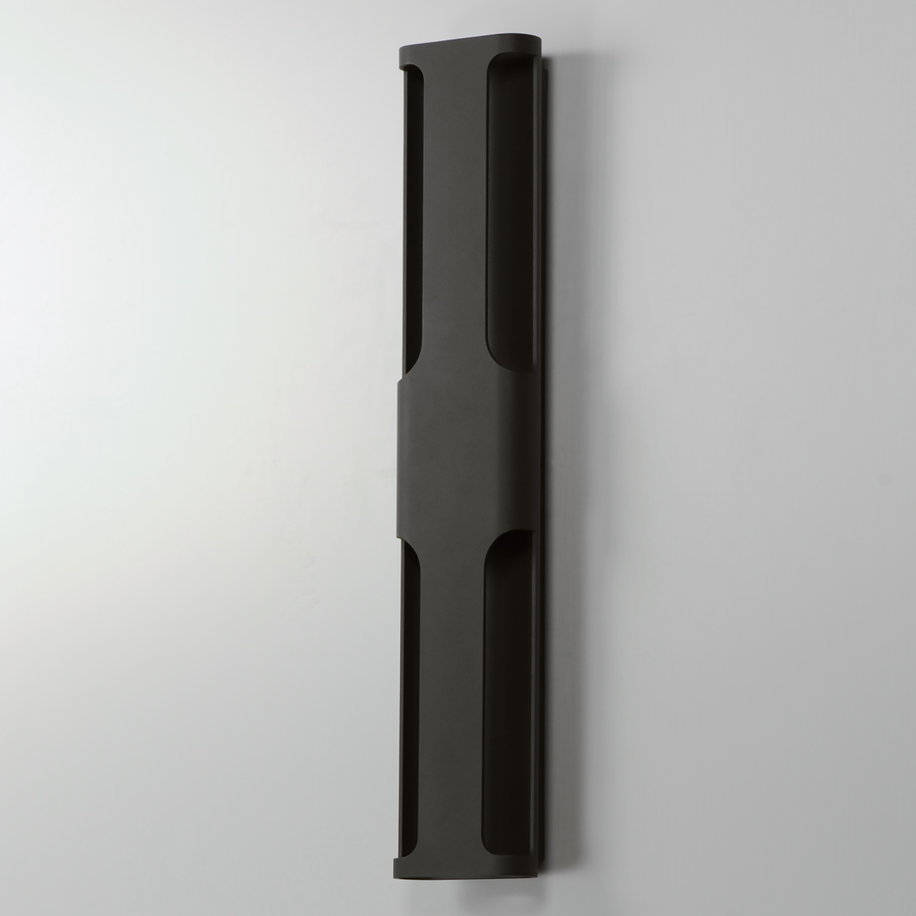 Large aluminum extrusions with indirect lighting highlights cut outs in this architectural outlook. Directed outwards toward the cutouts, these sconces are rated for outdoor applications. Select from Black or Architectural Bronze finishes and two sizes of sconce, one of which is scaled for larger façade applications.